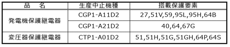 保護継電器 Updated by 事業推進チーム on 2026/04/17 08:40 < 対象機種 > < 代替機種 > 代替機種はございません。現行製品にて保護システムの新規ご検討をお願いいたします。 < 生産中止理由 > 電子部品の代替部品へ置換、部品保守にて生産を維持しておりましたが、 代替部品の選定が困難、且つ保守部品も枯渇することから生産継続が困難となりました。 < スケジュール > 2027年3月31日 受注締切 詳細は こちら Tags: 生産中止, 高圧機器 Back to Blog