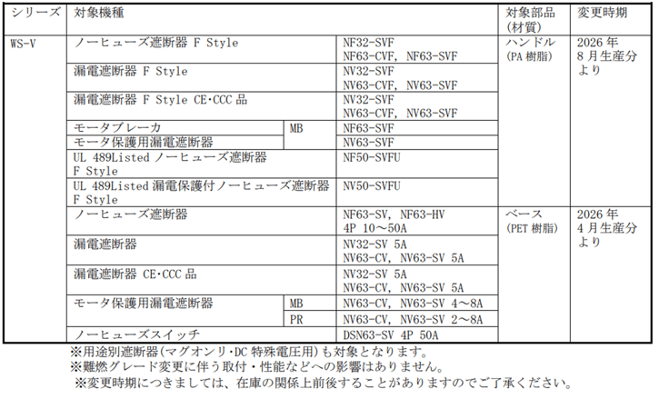 ノーヒューズ遮断器・漏電遮断器 Published by 事業推進チーム on 2025/11/17 13:08:56 < 対象機種 > < 変更内容 > 材料メーカのUL対象認証再取得に伴い、対象機種・部品のUL94規格 難燃グレードを「V-2」⇒「V-0」に変更 詳細は こちら Tags: 仕様変更, ブレーカ Back to Blog