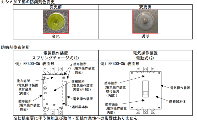 ノーヒューズ遮断器・漏電遮断器 Published by 事業推進チーム on 2025/11/17 12:53:18 < 対象機種 > < 変更内容 > < 変更理由 > 防錆剤の生産中止のため。 詳細は こちら Tags: 仕様変更, ブレーカ Back to Blog