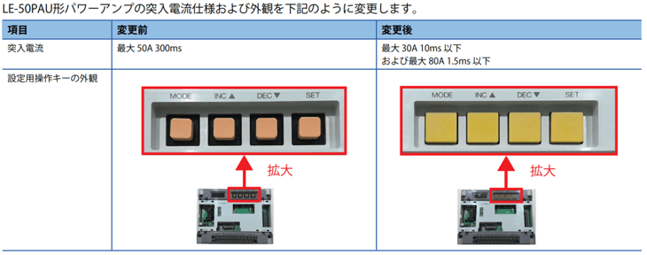 テンションコントローラ Published by 事業推進チーム on 2025/11/17 13:06:45 < 対象機種 > パワーアンプ:LE-50PAU < 変更内容 > < 変更理由 > 製品の供給安定性確保に伴う部品変更のため。 詳細は こちら Tags: 仕様変更, テンションコントローラ Back to Blog